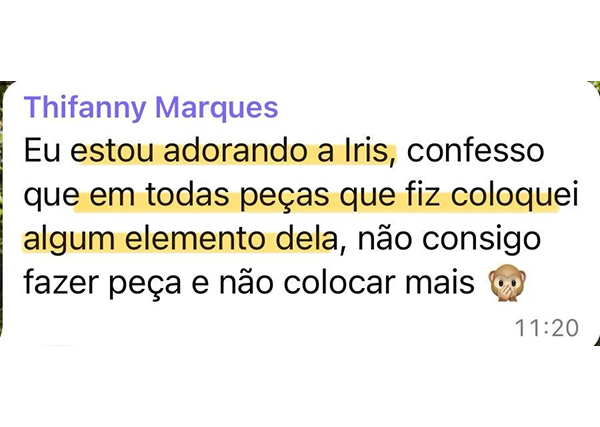 "Adorando a Iris. Em todas as peças que fiz coloquei algum elemento dela."